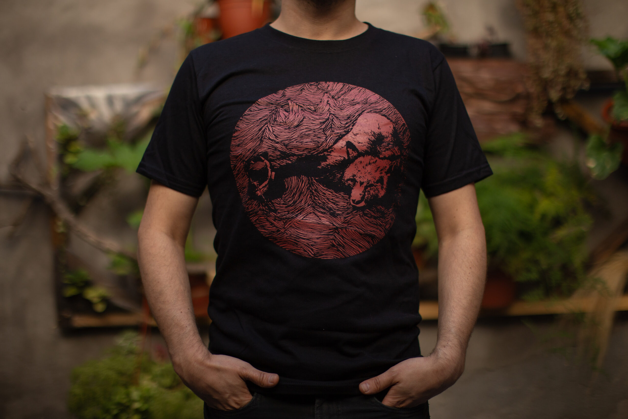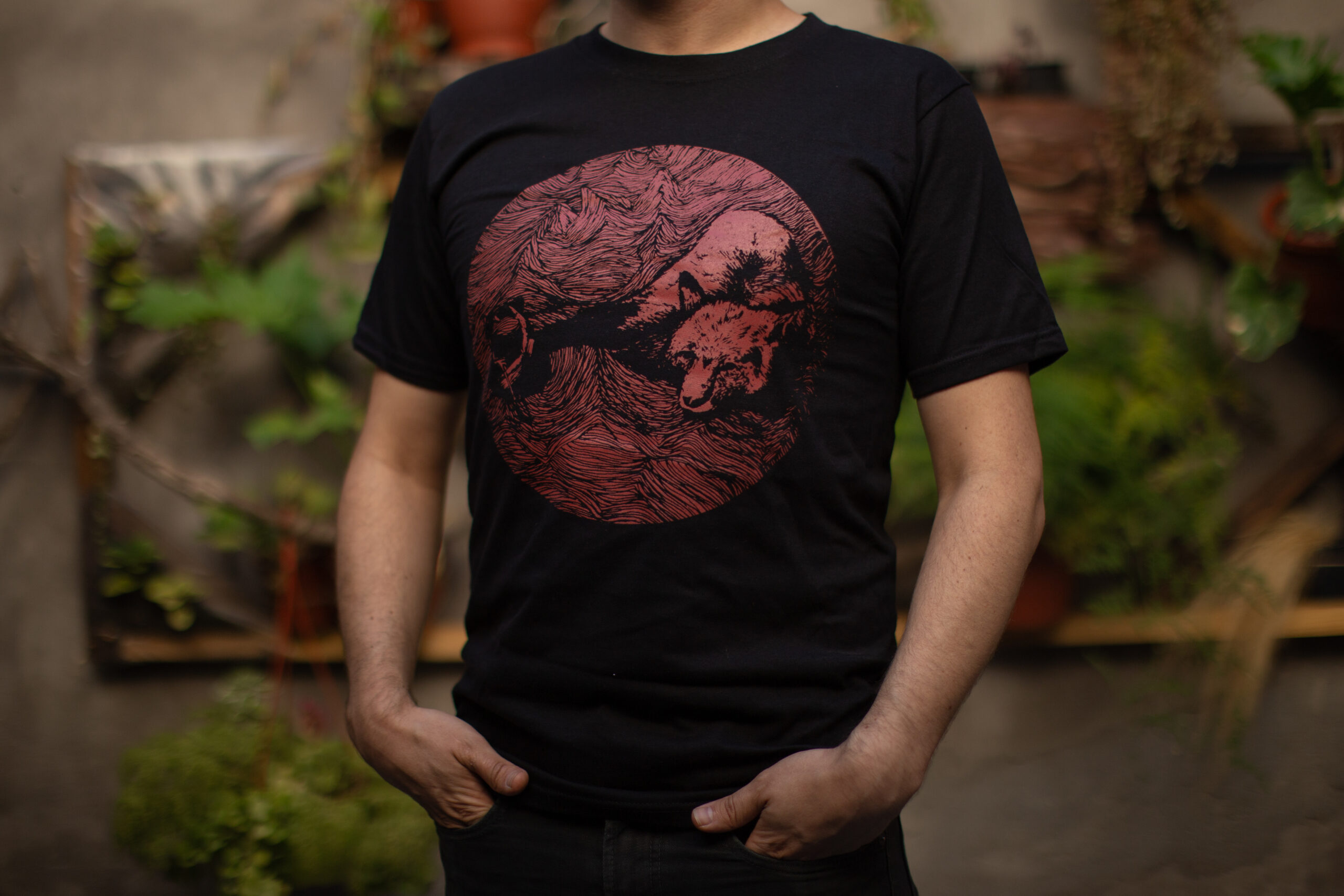 Polera negra de algodón con estampado en serigrafía.